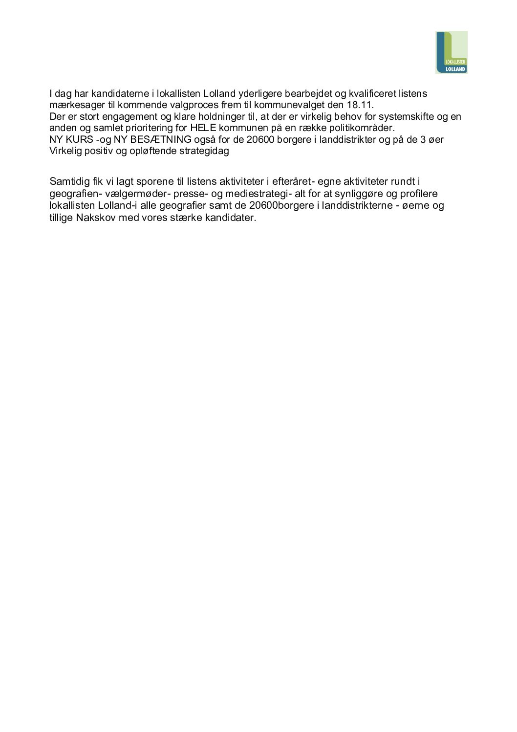 ForsideLokallisten LollandBliv medlemFormanden informererI dag har kandidaterne i lokallisten Lolland yderligere bearbejdet og kvalificeret listens mærkesager til kommende valgproces frem til kommunevalget den 18